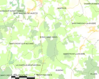 Sceau-Saint-Angel liegt knappe sechs Kilometer (Luftlinie) südsüdöstlich von Nontron und vier Kilometer westsüdwestlich von Saint-Pardoux-la-Rivière. Périgueux im Süden ist 33 Kilometer entfernt.