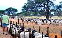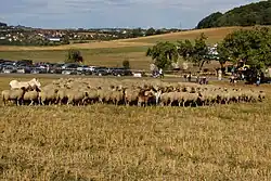 In der DDR wurden Schafe vor allem zur Wollproduktion gehalten. Auf diese Weise konnten Devisen für den Import von Schafwolle aus Australien oder Neuseeland gespart werden. Das führte zum Aufbau von 6000 Schafherden mit 2,65 Mio. Tieren (gesamte Bundesrepublik 2018: 1,6 Millionen Tiere).[7] Das Lammfleisch wurde zu 90 % in die Bundesrepublik und in den arabischen Raum exportiert. Jede LPG wurde verpflichtet, eine Schafherde zu halten. In der DDR waren ca. 6000 Schäfer tätig, der Berufsnachwuchs wurde an einer speziellen Schäferschule ausgebildet. Nach der Wende entfiel die Notwendigkeit der Devisenbeschaffung und der Schafbestand sank deutlich.[8]