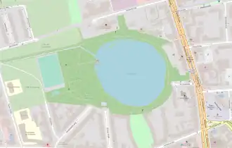 Im Norden befinden sich die 1962 eingeweihte und inzwischen denkmalgeschützte Stadtbibliothek, ein Freizeit- und ein Seniorenheim. Unmittelbar östlich des Sees befindet sich der U-Bahnhof Franz-Neumann-Platz der Linie U8.