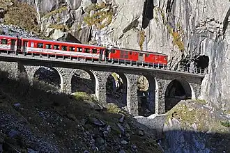 Die Schöllenenbahn ist eine einspurige Zahnradbahn im Schweizer Kanton Uri. Sie verbindet Göschenen mit Andermatt und durchquert die Schöllenenschlucht der Reuss. Sie weist eine Maximalsteigung von 179 Promille auf. Die Strecke wurde zwischen 1913 und 1917 durch die Schöllenenbahn AG (SchB) erstellt, welche am 17. Juni 1904 von der Bundesversammlung die Konzession für den Bau und Betrieb einer Eisenbahnlinie erhalten hatte. Diese fusionierte am 31. Dezember 1960 mit der Furka-Oberalp-Bahn, kurz FO, welche wiederum am 1. Januar 2003 mit der Brig-Visp-Zermatt-Bahn, kurz BVZ, zur Matterhorn-Gotthard-Bahn, kurz MGB, fusionierte. Heute befördert die Schöllenenbahn im Jahr zirka 400'000 Reisende. Sie hatte in der Vergangenheit auch eine grosse militärische Bedeutung, weil sie die Festungsanlagen des Réduit im Gotthardmassiv versorgte. Die Strecke hat eine Gesamtlänge von 3770 Metern, davon sind 2509 Meter mit einer Zahnstange ausgerüstet. 1022 Meter befinden sich in Tunneln und 1110 Meter in Galerien. Auch besitzt sie mehrere Brücken mit einer Gesamtlänge von 260 Metern.[5] Die Bahn fährt durch fünf Tunnel und fünf Galerien. Vier Mal fährt die meterspurige Schmalspurbahn über eine Brücke.[6]