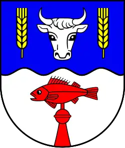 Blasonierung: „Von Blau und Silber im Wellenschnitt geteilt. Oben ein frontal gestellter silberner Ochsenkopf zwischen zwei goldenen Ähren, unten eine wachsende rote Kirchturmspitze mit kugelförmigem Knauf, in ihrem oberen Teil überdeckt mit einem roten Barsch.“[27]