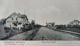 1902 wurden die meisten Ackerflächen auf dem großen Feld vom Lebensreformer Bruno Wilhelmi gekauft. Dieser hatte bereits an der Gründung der Obstbausiedlung „Eden“ in Oranienburg mitgewirkt. Wilhelmi wollte eine Gartenstadtsiedlung in Woltersdorf anlegen. Er parzellierte die erworbenen Ackerflächen in Grundstücke von rund 1000 m², damit jedes Grundstücken über einen Garten verfügte, der groß genug zur Selbstversorgung sei.[4] Die Parzellierung und der Verkauf der Grundstücke erfolgte in Schönblick-Ost durch Bruno Wilhelmi und in Schönblick-West östlich der Lerchenstraße ebenfalls durch Wilhelmi, westlich der Lerchenstraße durch den Kaufmann Heinrich Polte. Am 4. Mai 1903 wurde erstmals der Begriff „Schönblick“ in der Gemeindevertretung verwendet. Die Gemeindevertretung forderte zur Gründung des Villenterrains Schönblick: „[…] daß die Straße vom Dorfe nach dem zu erschließenden Terrain, sowie die auf diesem befindlichen zur Bebauung vorgesehenen Straßen vorerst provisorisch mit Kalksteingrus und Chausseesteinschütte vorschriftsmäßig befestigt werden, […]“[5] Am 4. April 1904 gründeten 28 Parzellenbesitzer den „Grundbesitzerverein Schönblick e. V.“. Dieser Verein vertrat die Siedlungsgemeinschaft in der Gemeinde und prägte den Ortsteil. So wurde die Pflasterung oder zumindest Regulierung aller Straßen im Ortsteil organisiert und die Gemeinde davon überzeugt, Baugenehmigungen nicht erst nach dem Ausbau der Straße zu erteilen, sondern die Grundstücke ohne befestigte Straße mit einer Pflaster-Hypothek im Grundbuch zu belegen. Außerdem wurde die Pflanzung von Straßenbäumen in nahezu allen Straßen angeregt. 1906 schlug der Grundbesitzerverein Straßennamen vor, die bis auf einige Änderungen von der Gemeindevertretung angenommen wurden. So wurde die Florastraße zur Moltkestraße (später Heinrich-Heine-Straße), die Idunastraße zur Bismarckstraße (später Robert-Koch-Straße) und die Sonntagstraße zur Kirchstraße (später Etkar-André-Straße). Außerdem setzte sich der Grundbesitzerverein seit seiner ersten Sitzung für die Schaffung eines Wasserwerks in Woltersdorf ein und auch durch seinen Einsatz gab es ab 1909 im alten Dorf und in Schönblick fließend Wasser. Ebenfalls seit 1909 gab der Grundbesitzerverein die Zeitung Das Echo von Schönblick heraus. Außerdem wurde eine „ästhetische Baukontrolle“ eingerichtet, die Besitzer wurden in Fragen der Gartenarbeit beraten und es gab große Feste. Ein wichtiges Anliegen des Grundbesitzervereins war die Verbesserung der Anbindung nach Berlin. Bis zur Gründung Schönblicks erfolgte der Anschluss nach Berlin über den Bahnhof Erkner. Aufgrund der Lage Schönblicks, kam jedoch der Bahnhof Wilhelmshagen eher als Anbindungspunkt infrage. So wurden ein Fußgängerweg durch den Köpenicker Forst und ein Tunnel zum Bahnsteig angelegt, für die der Grundbesitzerverein die Kosten übernahm. Der Tunnel wurde am 1. Juni, der Fußweg am 5. Juli 1908 fertiggestellt.[6]