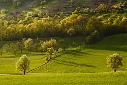 Die Südlage und die kargen Böden am Hang (Mergelböden und Mittlerer Keuper) waren die Voraussetzung für Streuobstwiesen und Weinberge. Die Streuobstwiesen im Foto – leicht verborgen hinter einer den Wirtschaftsweg säumenden Baumreihe – liegen noch im Naturschutzgebiet. Der hier sichtbare, von Breitenholz bewirtschaftete Weinberg, ist aus dem Schutzgebiet ausgenommen.