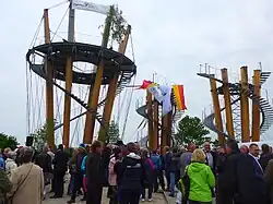 Das Montagekonzept wurde von der Firma Stahlbau Urfer entwickelt, die als Generalunternehmer während der Bauphase fungierte.[23] Es sah vor, den Turm in drei Segmenten zu montieren. Zunächst wurden hierzu die oberen beiden Segmente auf dem Stellberg nahe dem eigentlichen Standort montiert und mit Hilfsgerüsten stabilisiert. Alle Segmente bestanden aus den Stützen der jeweiligen Ebene und den daran montierten Treppen. Das oberste Segment umfasste zudem die mittlere und obere Plattform, die Mastspitzen sowie die bereits angehängten Abspannseile. Beim sogenannten „Big Lift“ am 7. Mai 2018 wurden die Segmente aufeinandergesetzt. Hierzu hob ein 500-Tonnen-Autokran zunächst das oberste Segment auf das mittlere, das mit der unteren Plattform auf dem Boden stand. Nachdem diese beiden Segmente miteinander verbunden worden waren, wurde dieses 25 Meter hohe Doppelsegment vom Kran auf das unterste Segment gesetzt, das als einziges der Segmente bereits am endgültigen Standort montiert worden war. Einschließlich der Hilfskonstruktionen hatte der Kran hierbei eine Last von 100 Tonnen zu halten. Erst als die Abspannseile eingehängt und abgespannt waren, stand der Turm selbst. Vorteilhaft bei diesem Vorgehen war zum einen, dass ein Großteil der Montagearbeiten vergleichsweise bodennah ausgeführt werden konnte und zum anderen, dass keine aufwendige Hilfskonstruktion erforderlich war, um den Turm während der Bauphase zu stabilisieren.[18]