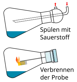Nach der vollständigen Verbrennung entsteht durch die Absorption der Verbrennungsgase ein Unterdruck im Kolben. Der Kolben wird jetzt gut geschüttelt, um eine möglichst rasche und vollständige Absorption zu gewährleisten. Der Anteil an Halogenen in der Lösung kann zum Beispiel über Titration oder chromatographische Verfahren ermittelt werden.[2]