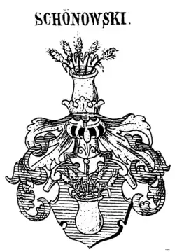Laurenz Bernhard Schönowski, aus Friedek im Fürstentum Teschen stammend, wurde am 15. Februar 1712 in den böhmischen Adelsstand mit dem Prädikat von Schönwiese erhoben.[2]