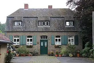 Ursprünglich wurde das Hofensemble als fränkischer Viereckshof errichtet. Mit dem ersatzlosen Abriss des Torhauses, in dem die Gesindekammern untergebracht waren, entstand ein nunmehr zur Straßenseite offenes Gehöft. Der noch bestehende, niedrige Viehstall wurde nach Nordwesten zur Waldseite mit massiven Mauern und Schießscharten versehen. Die gegenüberliegende, hohe Fachwerkscheune mit einem Walmdach aus kurkölnischer Bauzeit existiert ebenfalls noch. Das Wohnhaus wurde beim Neubau 1893 im Stil der preußischen Forsthäuser der Jahrhundertwende gestaltet. In die Umfassungsmauer wurden links und rechts der Durchfahrt Kottenforster Grenzsteine (sogenannte Marksteine)[8] aus dem 17. bis 19. Jahrhundert eingelassen. Das Wohnhaus verfügt über einen mittigen Eingang mit links und rechts je zwei Fensterachsen. Im Krüppelwalmdach befinden sich auf jeder Seite drei Mansardenfenster.[3]