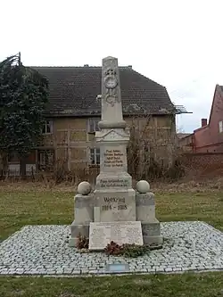Das Denkmal ist den Gefallenen des Ersten Weltkriegs gewidmet. Es ist obeliskförmig und hat oben ein Relief mit einem Kreuz und Lorbeerkranz mit Schleifen. Auf dem Denkmal sind Namen von gefallenen Soldaten eingraviert. In der Mitte steht „Zum Andenken an die Gefallenen im Weltkrieg 1914 - 1918“. Im Jahr 2011 wurde das Denkmal komplett saniert.[5]