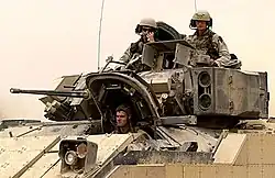 Ebenfalls zu Beginn der 1960er Jahre begann in den USA die Entwicklung eines modernen Schützenpanzers. Die Entwicklung wurde jedoch durch hohe Anforderungen, aber auch durch technische Probleme und Kürzung von Haushaltsmitteln nachhaltig verzögert. Der im Rahmen des Mechanized Infantry Combat Vehicle-Programms 1965 in fünf Prototypen gebaute XM701 (auch als MICV-65 bezeichnet) wurde nicht weiterentwickelt, da er für den Transport sowohl in der Lockheed C-130 als auch der Lockheed C-141 zu groß und zu schwer war.[7] Auch der 1967 von der Food Machinery Corporation (FMC) vorgestellte XM765 wurde von der US Army abgelehnt, war aber immerhin Basis für das im Export erfolgreiche Advanced Infantry Fighting Vehicle.[8] 1972 erhielt schließlich die Ordnance Division von FMC den Auftrag für die Entwicklung eines neuen Schützenpanzers. Aus dem Projekt XM723 ging schließlich der M2/M3 Bradley hervor. Von Anfang an war dabei die Entwicklung eines Schützen- und eines Spähpanzers geplant, die technisch weitgehend identisch aufgebaut sein sollten. Konzeptionell lehnte sich das Fahrzeug eng an den BMP an. Auch hier bestand die Bewaffnung aus Panzerabwehrlenkflugkörpern, einer Maschinenkanone und einem Maschinengewehr. Ebenso wie beim BMP konnte die Besatzung das Gefechtsfeld aus dem hinteren Kampfraum beobachten und den Feuerkampf vom Fahrzeug aus führen. Die 25-mm-Kanone M242 Bushmaster ist jedoch deutlich leistungsfähiger als ihr sowjetisches Gegenstück. Bei der Panzerung wurden mit einer Verbundpanzerung konstruktiv neue Wege beschritten. Die Grundpanzerung besteht aus Aluminiumlegierungen und bietet im Vergleich zu einer Stahlpanzerung gleicher Stärke nur einen geringeren Schutz. Seitlich wird der M2/M3 daher durch eine zusätzliche Schottpanzerung aus Panzerstahl geschützt, der Turm besteht ebenfalls aus einer Aluminiumkonstruktion mit aufgenieteten Stahlplatten. Bei weiteren Versionen wurde die Panzerung nochmals verstärkt.[9]