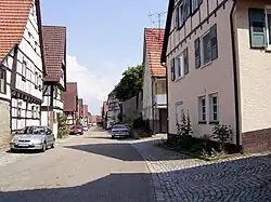 Im Ortskern des alten Straßendorfes reihen sich in der Hauptstraße und der Illinger Straße kleine Hakenhöfe und beeindruckende Fachwerkhäuser aneinander. Das älteste, gegenüber der Kirche, stammt von 1558, die anderen aus dem 17. und 18. Jahrhundert.