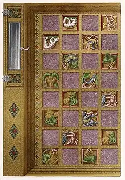Das Spielbrett ist zweiseitig angelegt und kann wie ein Diptychon zusammengeklappt werden. Im geöffneten Zustand hat es die Maße 34,8 × 46,4 × 3,7 Zentimeter.[3]