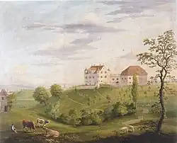 Auf einem kleinformatigen Ölgemälde ist das Landgut als stattliches, schlossartiges Anwesen mit Wirtschaftsgebäuden, Zier- und Obstgärten dargestellt. Es stammt wahrscheinlich vom Kempter Bleichermeister Johann Balthasar Widemann (1789–1845).[3] Widemann, von dem mehrere Gemälde dieser Gattung vorliegen, erwarb als Autodidakt grundlegende Fertigkeiten der Landschaftsmalerei.