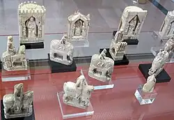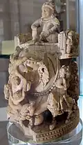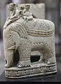Eine andere wertvolle Figur aus Elfenbein, die zu den Schachfiguren von Saint-Denis gehörte, wird heute nicht mehr dem übrigen Figurensatz zugeordnet. Die Skulptur ist fein ausgearbeitet und zeigt einen auf einem Elefanten thronenden Herrscher; neben und auf dem Tier sind weitere Krieger dargestellt, darunter zwei besiegte gegnerische Soldaten.[7] Das in der Literatur auch „Charlemagne-König“ genannte Objekt entstand unter indischem Einfluss im 9. oder 10. Jahrhundert. Eine kufische Aufschrift deutet auf einen arabischen Auftraggeber hin. Aufgrund des hohen Alters käme die Figur als Überrest des legendären Schachspiels theoretisch in Frage.[8] Diese Überlegung lässt sich aber nicht weiter erhärten. Zudem ist umstritten, ob es sich überhaupt um eine Schachfigur handelt.