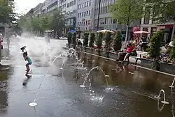Vor dem Karstadt-Kaufhaus wurde als Endpunkt der Umgestaltung etwa Anfang Juni 2022 ein sogenanntes Wasserspiel installiert, bei dem kleine Fontänen an einigen Stellen aus dem Boden steigen. Dieses geriet als „Nicht-Brunnen“ direkt in die Kritik, eine Tageszeitung nannte es in ihrer Überschrift als „so charmant wie ein Wasserrohrbruch“.[15] Nachdem ein Fahrradfahrer dort ein vierjähriges Kind angefahren und so sehr verletzt hatte, dass es ambulant Krankenhaus im Krankenhaus behandelt werden musste, wurde der Radweg durch Blumenkübel abgegrenzt.[16]