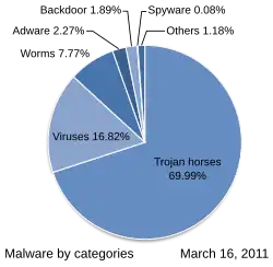 Je nach der Art ihrer schädlichen Auswirkungen gibt es eine Vielzahl weiterer, mehr oder weniger etablierter Bezeichnungen für Malware. Oft handelt es sich bei diesen Programmen um Trojanische Pferde, da sie sich nicht selbstständig oder automatisiert weiterverbreiten können. Eine häufig verwendete Kurzform ist Trojaner, dieser Begriff wird aufgrund seiner Wortherkunft aber häufig als falsch angesehen. Allerdings ist der Begriff in der deutschen Sprache sowohl im Fachbereich als in der Allgemeinheit fest etabliert und stellt somit eine korrekte Bezeichnung dar. Ein Trojanisches Pferd lädt man meist aufgrund von Täuschung aus dem Internet, fängt es sich als Drive-by-Download ein, oder bekommt es versehentlich oder absichtlich zugespielt.[9]