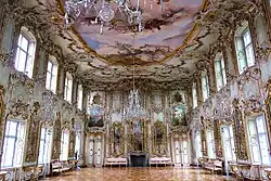 Besonders prächtig gerieten die Innenräume. Die glanzvolle Einweihung fand am 28. April 1770 statt. „Stargast“ war die 14-jährige Marie-Antoinette, die sich auf ihrer Brautfahrt nach Versailles befand und eine Zwischenstation in Augsburg machte. Im zweigeschossigen Festsaal tanzte die dem französischen Dauphin und späteren König Ludwig XVI. versprochene jüngste Tochter der Kaiserin Maria Theresia der Legende nach ein Paar roter Schuhe durch.[1][2]