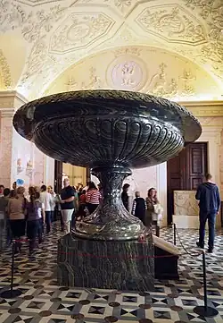 Die Ausstellungshalle, in deren Mitte sich die Schale befindet, ist Teil des Gebäudes der „Neuen Eremitage“. Der Ausstellungsort wurde 1851 nach einem Entwurf von Leo von Klenze gestaltet. Nach dem Plan von Klenze sollte die Halle Vestibül der Neuen Eremitage werden. Die Hallenwände bestehen aus Stuckmarmor und täuschen weißen Marmor vor. An und vor den Wänden sind marmorne Herrscherportraits aus dem späten 1. Jahrhundert bis zur Mitte des 2. Jahrhunderts aus der römischen Antike aufgestellt. Es handelt sich um eine der bedeutendsten Sammlungen römischer Portraitkunst.