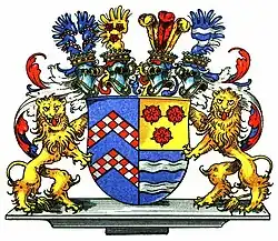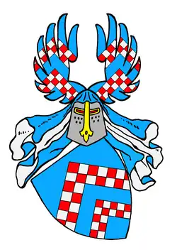 - Das Stammwappen zeigt in Blau zwei von Rot und Silber in zwei Reihen gerautete Sparren. Auf dem Helm mit blau-silbernen Decken ein offener, wie der Schild bezeichneter Flug.