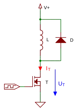 Da sich der Strom durch eine Induktivität aufgrund der lenzschen Regel nicht schlagartig ändern kann, fließt dieser auch während des Abschaltvorgangs solange in nahezu gleicher Höhe durch den Transistor weiter, bis die Spannung am Transistor Versorgungsspannungspotenzial annimmt. Ab diesem Punkt beginnt die Freilaufdiode zu leiten und der Strom kommutiert vom Transistor zur Diode. Für diese Betrachtung wird vorausgesetzt, dass die Induktivität und somit die beim anfänglichen Strom gespeicherte Energie im Verhältnis zur Energie, die während des Schaltvorgangs umgesetzt wird, sehr groß ist. Somit ändert sich der in die Induktivität eingeprägte Strom kaum und kann vereinfacht als konstant angenommen werden.