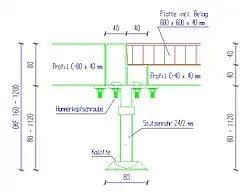 Die Schaltwartenunterkonstruktion besteht aus miteinander verschraubten verzinkten C-Profilen, Gehbereich 40 × 40 mm, Bereich der Schrankfelder 80 × 40 mm. Die Oberkante der Schrankfelder ist bündig zur Oberkante der Doppelbodenplatten. Die Profile werden mit Stützen gemäß VDE 0100 verschraubt, welche in der Höhe zum Ausgleich von Bodenunebenheiten verstellbar sind. Die Stützenfüße stehen in lastverteilenden Kalotten, die mit Kleber auf dem Untergrund fixiert werden. Schrankrahmen werden passgenau angefertigt. Die nach unten offenen Rahmen ermöglichen einfachste Zuführung der Verkabelung von Schaltschränken. Ein Verschließen der Rahmen mit Doppelbodenplatten (Reservefelder) ist möglich.