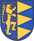 Blasonierung: „Im gespaltenen Schild vorn in Blau im mit roten Herzen bestreutem Feld ein links gewandter rotbewehrter und -gezungter goldener Löwe, hinten in Blau am Spalt drei linke goldene Spitzen.“[13] |