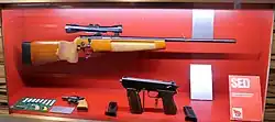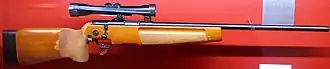 Das vierfach vergrößernde Zielfernrohr stammt aus dem VEB Carl Zeiss Jena („Ziel4/S“ 4×32 ZF, Absehen 1) und ist mit einer Suhler Schwenkmontage befestigt.[4]