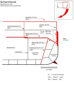 - ↑ Scharnhorst, Gneisenau Gewichte, abgerundete und zwischen beiden Schiffen gemittelte Zahlen, B.Nr. A V 309/39 G.Kdos, Berlin 3./5. Mai 1939; BA-MA-RM-20-1913 Schiffbauplan Typen 1939-40