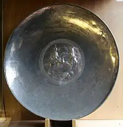 Otto von Hessen brachte 1968 die im Museum verteilten Stücke wieder zusammen und datierte die Schale auf das späte 6. bis frühe 7. Jahrhundert. In seinen Augen war die Arbeit „ohne Zweifel langobardisch“. Seine Datierung basierte auf dem erkennbaren Spangenhelm und dem Lamellenpanzer. Er sah darin den Kampf eines Langobarden gegen zwei andere Barbaren. Allerdings erkannte er, dass es sich bei dem „tesoretto“ um das Opus einer byzantinischen Werkstatt handeln musste.[6] Wilfried Menghin schrieb 1985, der Krieger trage typisch langobardische Tracht.[7]