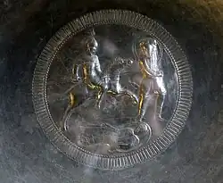 Im Mittelpunkt der Debatte, die fast sogleich nach der Entdeckung begann, stand die Darstellung dreier kämpfender Männer, deren Kleidung und Bewaffnung recht genau erkennbar sind, wobei einer von ihnen zu Pferde kämpfte und einen der anderen Männer mit einer Lanze durchbohrte. Bernardino Biondelli deutete die abgebildeten Männer als barbarische Krieger, von denen der Berittene seiner Auffassung nach Theoderich der Große war.[3] Damit wäre das Stück zwischen dem Ende des 5. Jahrhunderts und 526 zu datieren, dem Todesjahr Theoderichs.