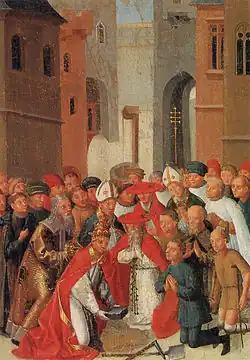 In Gegenwart hoher Geistlicher wird die Heilig-Blut-Reliquie von Mantua ausgegraben, deren Lage zuvor dem blinden Adilbero offenbart worden war. Heilig-Blut-Tafel der Abtei Weingarten, 1489