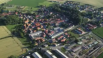 | Wappenbegründung: Die Farben des Ortes sind Weiß (Silber) – Rot. Das Wappen des Dorfes ist schon länger in Gebrauch. Seit der 1000-Jahr-Feier im Jahre 1973 wird es offiziell gezeigt. Die Kleeblätter deuten den landwirtschaftlichen Charakter der Umgebung an und sind zusätzlich Symbole des Glücks und des Wohlstandes. Obwohl der Ort eine sogenannte Reichsbaronie und lange im Besitz der freiherrlichen Familie Grote war, zeigen die Tinkturen die Farben des alten Bistums Halberstadt.