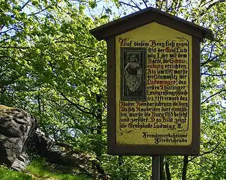 ![]() Erläuterungstafel an der Ruine der Stammburg der Ludowinger, der Schauenburg bei Friedrichroda | ||