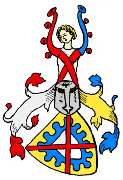 Silbernes Mittelschild und blau-goldener Wolkenrand belegt mit einem roten Andreaskreuz. Auf dem Helm eine wachsende silberne Jungfrau (die sogenannte Melusine), die Brust mit dem roten Andreaskreuz belegt und anstatt der Arme rechts ein rotes und links blaues Büffelhorn, außen mit je drei silbernen (oder roten) Schellen besteckt.[6]