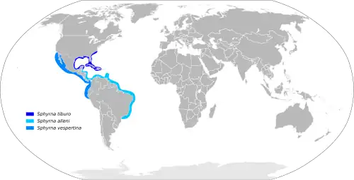 - ↑ a b Cindy Gonzales, Bautisse Postaire, William Driggers, Susana Caballero, Demian Chapman: Sphyrna alleni sp. nov., a new hammerhead shark (Carcharhiniformes, Sphyrnidae) from the Caribbean and the Southwest Atlantic. Vol. 5512 Nr. 4: 23 Sept. 2024, DOI: 10.11646/zootaxa.5512.4.2