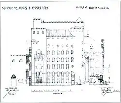 Das Zuschauerhaus wurde im Stil des Neobarock erbaut. Es entsprach somit einer der Möglichkeiten zur Gestaltung von Theatern in jener Zeit (Historismus). Das ihm zugeordnete Bühnenhaus war jedoch im damals neuen Baustil der Reformarchitektur errichtet. So hatte der Kubus aus unverputzten Ziegelwänden, mit Rundtürmen und Zinnenkranz einen „festungsartigen Charakter“[4] und orientierte sich an der Heimatgeschichte des Ortes (Heimatschutzarchitektur). So beginnt die geschriebene Geschichte des Düsseldorfer Stadtgebiets mit der Gründung eines Klosters in Kaiserswerth, wo Kaiser Friedrich Barbarossa später eine neue Kaiserpfalz als mächtige Zollfestung zur Abgabe des Rheinzolls erbaute.
