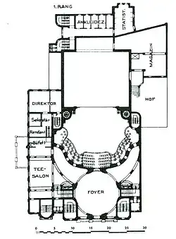 Das Haus hatte ein reduziertes Rangsystem. Dabei wurde der obere der beiden Ränge nicht mehr bis zum Proszenium durchgeführt und blieb auf den rückwärtigen Teil des Zuschauerraums beschränkt. Man dehnte die Bestuhlung des Parterres keilförmig aus und ließ die seitlichen Parterrelogen entfallen. Zugleich wurde auf die Proszeniumslogen und zugehörigen Logen verzichtet.