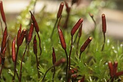 Die Sporophyten haben eine rote, 1 bis 1,5 Zentimeter hohe Seta und eine aufrechte, zylindrische Kapsel mit lang geschnäbeltem Deckel und kurzen, mehr oder weniger aufrechten Peristomzähnen. Die Sporen sind grünlich, gekörnelt und 10 bis 16 µm groß. Die Pflanzen sind diözisch.