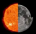 Mond- und Sonnenscheibe erscheinen gleich groß für Beobachter auf der Erde, die sie unter gleichem Winkel von 0,5° sehen: ihre scheinbare Größe entspricht jeweils dem Sehwinkel. Der Winkel hängt ab von dem Verhältnis des tatsächlichen Durchmessers zur Entfernung des Objekts.[1]
