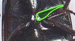 Abb. 3: Lacon punctatus Ausschnitt Unterseite Kopie unten teilweise koloriert blau: Umriss der Hinterhüfte; gelb: Teil des Hinterschenkels grün: Schenkeldecke rot: Rinne zur Aufnahme der Schenkel; |
