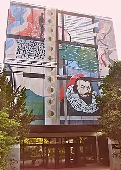 An der dreigeschossigen Eingangsfassade ist seit Juni 1992 Wilhelm Schickard abgebildet.[7] Die Umgestaltung der 140 Quadratmeter großen Fassade ging auf eine Initiative von Schülern zurück, die die künstlerische Ausführung unter der Anleitung zweier Kunstlehrer selbst übernahmen. Vorausgegangen war eine zehnjährige Auseinandersetzung um Genehmigung und finanzielle Zuschüsse mit Stadtverwaltung, Oberbürgermeister und dem Architekten, der die von ihm entworfene ursprünglich komplett graue Wand verteidigt hatte.