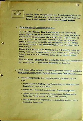 - Zögern Sie nicht mit der Anwendung der Schußwaffe, auch dann nicht, wenn die Grenzdurchbrüche mit Frauen und Kindern erfolgen, was sich die Verräter schon oft zunutze gemacht haben. […][17][18]