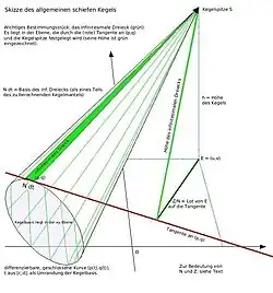 Die Basis des allgemeinen Schiefkegels ist eine geschlossene Kurve mit der Parameter-Darstellung x(t):= p(t) und y(t):= q(t), wobei p und q im Intervall [c,d] differenzierbar sind (bis auf höchstens endlich viele Ausnahmen), außerdem: p(c) = p(d) und q(c) = q(d). Der Punkt E = (u,v) liegt in der Kurven-Ebene, die Kegelspitze S steht im Abstand h senkrecht über E, also S = (u,v,h). Der folgende Formalismus gilt auch für nicht geschlossene Kurven, dann spricht man besser von Segeln als von Kegeln (Dreiecks-Segeln, geschwungenen Dreiecken). Um die Formeln übersichtlich zu halten, wird die Ableitung nach t (wie in der Physik üblich) mit einem Punkt versehen.