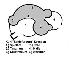 - ↑ a b c d Thomas Kantschew: Kinder- und Jugendhaus „Schieferburg“ in Dresden Gruna. In: Das neue Dresden. Architektur und Städtebau von 1918 bis heute. Abgerufen am 21. August 2015 (private Website).
