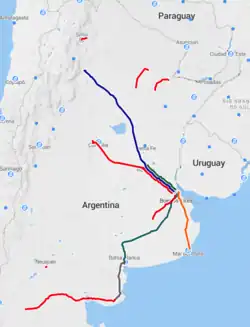 Metrotranvía Mendoza und Premetro (Buenos Aires) sind straßenbahnähnliche Stadtbahnen. Die Straßenbahn Tranvía del Este verkehrte nur von 2007 bis 2012. Von 1863 bis 1962 bestand ein dichtes Straßenbahnnetz in Buenos Aires, das in den 1920er- und 1930er-Jahren eine Streckenlänge von 875 km erreichte.[20]