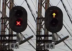 Die japanischen Eisenbahnsignale sind in einem Ministerialerlass des MLIT aus dem Jahr 2001 festgelegt.[14] Japan hatte am Anfang die britische Bahnsignaltechnik übernommen. Dazu gehört die Wegesignalisierung, die dem Triebfahrzeugführer anzeigt, ob und wohin er fahren darf. Er musste selbst wissen, wie schnell er dabei sein darf. Später orientierten sich die japanischen Bahngesellschaften mehr an den USA, wo eine Geschwindigkeitssignalisierung vorherrscht, also die höchste erlaubte Geschwindigkeit angegeben wird, aber verschiedene Fahrstraßen durch dasselbe Signal freigegeben werden können. So entstand ein Mischsystem aus Wege- und Geschwindigkeitssignalisierung.