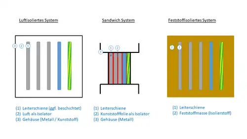 Hierbei sind die Leiterschienen durch dünne Kunststoff-Folien voneinander elektrisch isoliert aber mechanisch aufeinandergelegt. Das Gehäuse presst das System zusammen, es sind nur geringe Luftspalte innerhalb des Schienenblocks. Eine Wärmeabfuhr erfolgt über das Gehäuse, welches oftmals wie ein Kühlkörper ausgeführt ist.