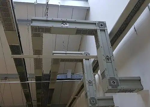 Stromschienen können geradlinig entlang der Gebäudekontur verlegt werden. Bei Richtungsänderungen werden keine Biegeradien wie bei Kabeln[3] benötigt. Die minimalen Biegeradien von Kabeln entsprechen gewöhnlich dem 4- bis 6-fachen Außendurchmesser[4] wodurch sich bei paralleler Verlegung von stärkeren Kabeln mit dem vorgegebenen Abstand[5] ein signifikanter Platzbedarf ergibt.