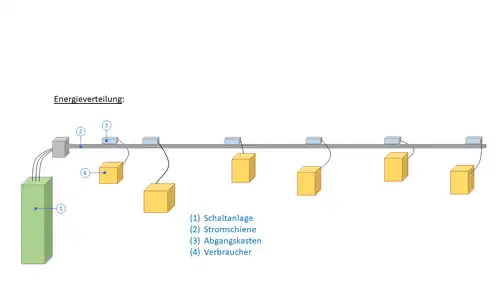 Schienenverteilersysteme eignen sich zum Energietransport als auch zur Energieverteilung von elektrischer Energie. Hierbei bezeichnet man als Transport die Verbindung zweier elektrischer Komponenten (zum Beispiel Transformator zur Schaltanlage). Energieverteilung bezieht sich auf die Ausbringung der elektrischen Energie von einer oder mehrerer elektrischen Quellen (Beispielsweise Niederspannungs-Schaltanlagen) zu dezentralen Verbrauchern (z. B. Motoren). Hierzu werden veränderbare Abgangskästen auf das Schienensystem aufgebracht, in dem sich Schalt- und/oder Schutzorgane befinden, welche der Absicherungen der Verbraucher dient.