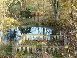 ![]() Blick von der Landstraße auf das Dach des Quellhauses und die vom Schierpkebach durchflossenen Teiche (2014). | ||