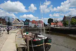 - Die Schiffbrücke in Husum liegt am innersten und damit geschütztesten Teil des sogenannten „Binnenhafens“, der hier der alte Seehafen ist. Das Kai diente früher als Stapelplatz.[5]